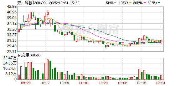 资金流向方面,主力资金净流出1777.86万元,特大单买入142.53万元,占比0.47%,卖出888.34万元, 占比2.92%;大单买入4920.52万元,占比16.17%,卖出5952.57万元,占比19.56%。 双一科技所属申万行业为:电力设备-风电设备-风电零部件。所属概念板块包括:碳纤维、航天军工、 轨道交通、3D打印、海上风电等。 12月30日,双一科技盘中上涨2.00%,截至13:43,报34.11元/股,成交3.04亿元,换手率8.30%,总市值 56.40亿元。 双一科技今年以来股价涨52.28%,近5个交易日涨11.22%,近20日涨14.93%,近60日跌9.38%。 今年以来双一科技已经4次登上龙虎榜,最近一次登上龙虎榜为8月15日,当日龙虎榜净买入2.71亿元; 买入总计4.45亿元 ,占总成交额比26.60%;卖出总计1.73亿元 ,占总成交额比10.37%。 资料显示,山东双一科技股份有限公司位于山东省德州市德城区新华工业园双一路1号,成立日期2000 年3月6日,上市日期2017年8月8日,公司主营业务涉及复合材料产品研发、设计、生产、销售和服务。 主营业务收入构成为:风电 ...
