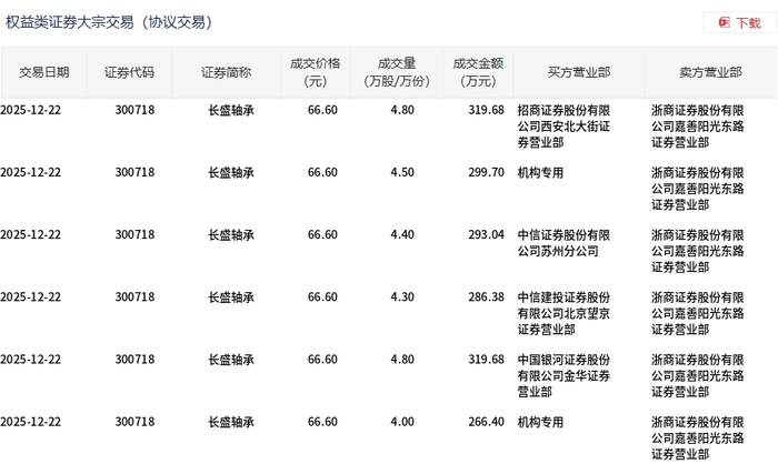 大宗交易概况 - 2025年12月22日,长盛轴承发生一笔大宗交易,总成交26.8万股,总成交额1784.88万元,占该股当日总成交额的1.33% [1] - 该笔大宗交易的成交价格为66.6元,较当日市场收盘价83.24元折价19.99% [1] 交易明细分析 - 该笔大宗交易由6笔分交易构成,成交价格均为66.6元 [2] - 分笔交易成交量在4.00万股至4.80万股之间,单笔成交金额在266.40万元至319.68万元之间 [2] - 所有分笔交易的卖方营业部均为浙商证券股份有限公司嘉善阳光东路证券营业部 [2] 买方结构分析 - 买方包括两家机构专用席位,分别买入4.50万股(299.70万元)和4.00万股(266.40万元) [2] - 其余买方为四家券商的营业部,分别是招商证券西安北大街营业部、中信证券苏州分公司、中信建投证券北京望京营业部和中国银河证券金华营业部 [2]