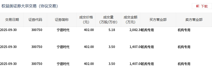 | 权益类证券大宗交易(协议交易) | | | | | | | | 团 下载 | | --- | --- | --- | --- | --- | --- | --- | --- | --- | | 交易日期 | 证券代码 | 证券简称 | 成交价格 (元) | 成交量 (万股/万份) | 成交全额 (万元) | 买方营业部 | | 卖方营业部 | | 2025-09-30 | 300750 | 宁德时代 | 402.00 | 5.18 | 2,082.3 | | 机构专用 | | | 2025-09-30 | 300750 | 宁德时代 | 402.00 | 3.50 | 1,407.00机构专用 | | 机构专用 | | | 2025-09-30 | 300750 | 宁德时代 | 402.00 | 3.50 | 1,407.0(机构专用 | | 机构专用 | | 9月30日,宁德时代大宗交易成交12.18万股,成交额4896.36万元,占当日总成交额的0.37%,成交价 402元,较市场收盘价402元持平。 ...