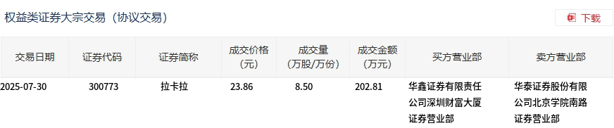 大宗交易概况 - 7月30日拉卡拉发生大宗交易成交8.5万股[1][2] - 成交金额达202.81万元[1][2] - 占当日总成交额比例0.11%[1] 价格分析 - 成交价格23.86元较市场收盘价27.42元折价12.98%[1][2] - 折价交易显示大宗交易价格显著低于二级市场价格[1] 交易细节 - 买方为华鑫证券有限责任公司深圳财富大厦证券营业部[2] - 卖方为华泰证券股份有限公司北京学院南路证券营业部[2] - 交易通过特定券商营业部完成[2]