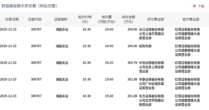 12月23日,海能实业大宗交易成交108.4万股,成交额1116.52万元,占当日总成交额的22.22%,成交价 10.3元,较市场收盘价11.32元折价9.01%。 | 交易日期 | 证券代码 | 证券商标 | 成交价格 | 成交量 | 成交金额 | 买方营业部 | 卖方营业部 | | --- | --- | --- | --- | --- | --- | --- | --- | | | | | (元) | (万股/万份) | (万元) | | | | 2025-12-23 | 300787 | 海能实业 | 10.30 | 20.00 | | 206.00 长江证券股份有限 | 红塔证券股份有限 | | | | | | | | 公司上海万荣路证 | 公司成都锦城大道 | | | | | | | | 券营业部 | 证券营业部 | | 2025-12-23 | 300787 | 海能实业 | 10.30 | 20.00 | | 206.00 机构专用 | 红塔证券股份有限 | | | | | | | | | 公司成都锦城大道 | | | | | | | | | 证券量补部 | | 2025-12-23 | 3 ...