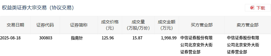 交易概况 - 2025年8月18日指南针发生大宗交易 成交15.87万股 成交额1998.99万元 占当日总成交额0.13% [1] - 成交价格125.96元 与市场收盘价持平 [1] 交易细节 - 证券代码300803 证券简称指南针 [2] - 买方营业部为中信证券北京安外大街证券营业部 [2] - 卖方营业部同为中信证券北京安外大街证券营业部 [2] - 交易通过同一券商营业部完成 属于内部对倒或账户间调仓 [2]