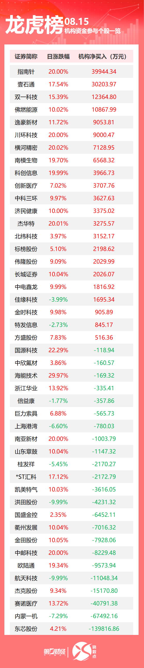 机构净买入股票情况 - 8月15日机构净买入前三股票为指南针(3.99亿元)、壹石通(3.02亿元)、双一科技(1.24亿元)[1] - 指南针当日涨幅20.00%且机构净买入3.99亿元[2] - 壹石通当日涨幅17.54%且机构净买入3.02亿元[2] - 双一科技当日涨幅15.39%且机构净买入1.24亿元[2] - 共有22只股票呈现机构净买入[1] 机构净卖出股票情况 - 机构净卖出前三股票为东芯股份(13.98亿元)、内蒙一机(6.75亿元)、赛诺医疗(4.08亿元)[1] - 东芯股份当日涨幅4.21%但机构净卖出13.98亿元[4] - 内蒙一机当日下跌7.29%且机构净卖出6.75亿元[4] - 赛诺医疗当日涨幅13.72%但机构净卖出4.08亿元[4] - 共有23只股票呈现机构净卖出[1] 龙虎榜整体交易数据 - 当日龙虎榜涉及45只个股[1] - 佛燃能源以10.02%涨幅获机构净买入1.09亿元[2] - 逸豪新材以11.72%涨幅获机构净买入0.91亿元[2] - 川环科技以20.00%涨幅获机构净买入0.90亿元[2] - 中邮科技虽涨幅20.00%但遭机构净卖出0.82亿元[4] - 欧陆通虽涨幅19.34%但遭机构净卖出0.96亿元[4] 特殊价格波动个股 - 海能技术以29.97%涨幅居涨幅榜首但遭机构净卖出169万元[3] - 国源科技以22.29%涨幅但遭机构净卖出119万元[3] - 航天科技以9.99%跌幅居跌幅榜首且遭机构净卖出1.10亿元[4] - 洋田股份以9.99%跌幅且遭机构净卖出0.42亿元[4] - 佳缘科技下跌3.99%但仍获机构净买入1695万元[3]