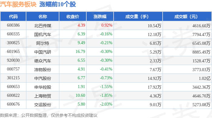 证券之星消息,12月30日汽车服务板块较上一交易日下跌0.77%,厦门信达领跌。当日上证指数报收于 3965.12,下跌0.0%。深证成指报收于13604.07,上涨0.49%。汽车服务板块个股涨跌见下表: | 代码 | 名称 | 收盘价 | 涨跌幅 | 成交量(手) | 成交额(元) | | --- | --- | --- | --- | --- | --- | | 600386 | 北巴传媒 | 4.39 | 0.92% | 10.54万 | liv 4616.60万 | | 600335 | 国机汽车 | 6.39 | -0.16% | 12.18万 | 7794.47万 | | 300825 | 阿尔特 | 9.49 | -0.21% | 1 6.85万 | 6545.08万 | | 601965 | 中国汽研 | 16.79 | -0.30% | 5.29万 | 8885.49万 | | 920030 | 德众汽车 | 6.55 | -0.30% | 2.33万 | 1528.47万 | | 000757 | 浩物股份 | 4.91 | -0.41% | 7.67万 | 3773.03万 | | 3 ...