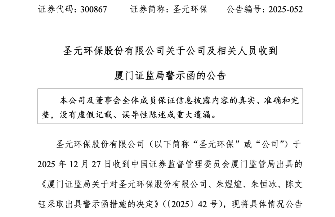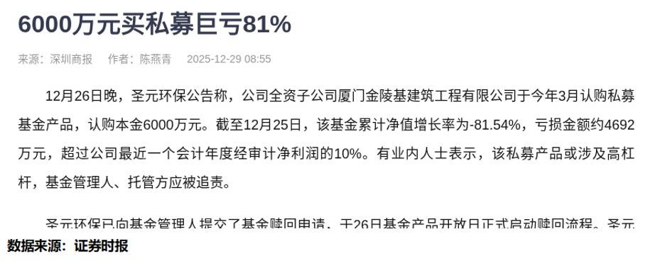 公司投资理财事件概述 - 圣元环保全资子公司厦门金陵基使用闲置自有资金6000万元,认购了由深圳深博信投管理的“深博宏图成长1号私募证券投资基金”,该基金为R4级中高风险产品 [1] - 公司于2025年12月计划赎回全部基金份额,但发现基金净值在2025年12月4日至11日的一周内急剧下降,单位净值从0.9215元跌至0.2596元,累计净值增长率从-7.85%恶化至-74.04% [2][3] - 截至2025年12月25日,基金最新单位净值为0.1846元,累计净值增长率为-81.54%,亏损金额约4692万元,超过公司最近一个会计年度经审计净利润的10% [3] 基金亏损原因与追责 - 公司调查初步结果显示,基金管理人深圳深博信投在运作过程中存在越权交易、违反信息披露义务甚至伪造基金份额净值信息等违法违规行为 [5] - 基金托管人招商证券被公司认为存在未履行监督核查义务的违规行为 [5] - 基金管理人曾提出由自然人温廷涛对投资本金损失承担连带清偿责任,但截至公告日,公司仅收到其支付的首笔200万元款项,后续款项均未收到,该自然人未完全履行承诺 [4] 公司采取的法律与监管行动 - 公司已就此事向公安机关报警并被受理,同时向中国证监会深圳监管局举报并收到材料接收证明 [5] - 公司已委托律师,拟对基金管理人深圳深博信投及基金托管人招商证券提起诉讼或仲裁 [6] - 公司已向基金管理人提交基金赎回申请,并正式启动赎回流程,将尽快将基金产品剩余财产全部赎回到账 [6] 公司面临的监管处罚 - 因公司知悉私募基金产品出现重大损失后未及时披露,直至2025年12月26日才对外公告,厦门证监局决定对圣元环保及董事长朱煜煊、总经理朱恒冰、董事会秘书陈文钰采取出具警示函的监督管理措施 [6][7] - 深圳证券交易所亦对公司及相关人员朱煜煊、朱恒冰、陈文钰下发监管函,要求其充分重视问题、吸取教训并及时整改 [6] 相关方回应 - 招商证券托管部回应称,该产品为R4级中高风险且无止损线约定,公司已按照法规和合同履行了托管人职责,对违反合同情况履行了监督提示职责 [7] - 招商证券表示,投资者提供的用于验证的产品净值文件材料经核查系经过篡改,文件中附有公司用印文件验证平台链接可供验证真伪 [7] - 招商证券指出,管理人与投资者在基金合同之外达成的承诺函情况,公司并不知情,也无法定义务监督其执行 [7]