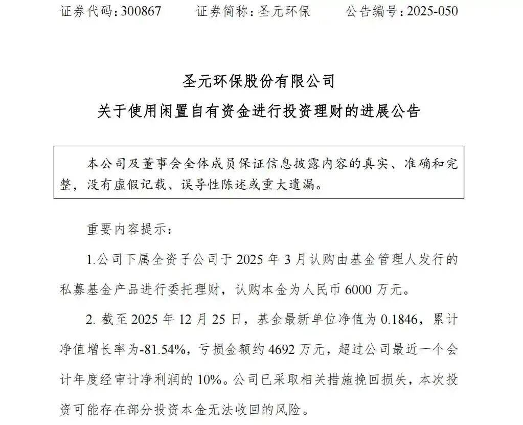 事件概述 - 圣元环保全资子公司委托理财出现重大亏损 控股股东与实际控制人承诺对投资本金损失进行先行补偿 [1][3] - 公司及相关人员因未及时披露该重大损失 收到厦门证监局出具的警示函 [3] 委托理财亏损详情 - 子公司于2025年3月认购私募基金产品 初始投资本金为人民币6000万元 [3][5] - 2025年12月12日收到的净值数据显示 基金单位净值从12月4日的0.9215元骤降至0.2596元 一周内累计净值增长率从-7.85%扩大至-74.04% 基金资产从5529.00万元缩水至1557.69万元 [5] - 截至2025年12月25日 基金最新单位净值跌至0.1846元 累计净值增长率为-81.54% 亏损金额约为4692万元 [5] - 该亏损金额已超过公司最近一个会计年度经审计净利润的10% [5] 控股股东补偿承诺 - 控股股东、实际控制人朱煜煊与朱恒冰承诺就基金产品投资本金损失进行先行补偿 [1][3] - 最终补偿金额为公司初始投资本金6000万元 扣除基金赎回到账金额和公司实际追回的全部款项后的差额 [3] 公司应对措施 - 公司发现亏损后成立专项工作小组启动应急处理 [6] - 工作小组与基金管理人沟通后 基金管理人方面提出由自然人温廷涛对投资本金损失承担连带清偿责任 [6] - 温廷涛签署了相关债务承担承诺函 但截至公告披露 公司仅收到首笔200万元款项 后续款项未按约定到账 [6] - 经初步核查 基金管理人存在越权交易、违反信息披露义务、伪造基金份额净值信息等违法违规行为 基金托管人未履行监督核查义务 [6] - 公司已就此事向公安机关报警并获受理 同时向中国证监会深圳监管局举报并收到材料接收证明 [6] 事件影响 - 相关事项可能对公司2025年度经营业绩产生较大影响 [5]