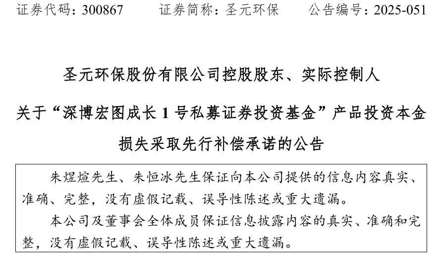 【圣元环保:控股股东、实际控制人承诺对6000万元基金投资本金损失进行先行补偿】智通财经12月27 日电,圣元环保(300867.SZ)公告称,公司下属全资子公司于2025年3月认购的"深博宏图成长1号私募证 券投资基金"产品出现本金损失,亏损金额约4692万元,超过公司最近一个会计年度经审计净利润的 10%。为保障公司及股东利益,公司控股股东、实际控制人朱煜煊和朱恒冰承诺对投资本金损失进行先 行补偿,补偿金额为初始投资本金6000万元减去基金赎回到账金额和公司实际追回的全部款项后的差 额。承诺人将最迟于公司2025年年度报告披露日之前将补偿金额足额支付至公司指定账户。 转自:智通财经 ...