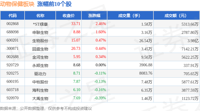 市场整体表现 - 2023年12月19日,动物保健板块整体上涨0.42%,表现优于上证指数(上涨0.36%)和深证成指(上涨0.66%)[1] - 板块内个股涨多跌少,在列出的20只股票中,有12只上涨,2只下跌,其余数据缺失或持平[1][2] 领涨个股表现 - 回盛生物领涨板块,收盘价20.75元,单日涨幅2.47%,成交额9296.17万元[1] - 驱动力涨幅2.43%,收盘价9.27元[1] - 申联生物涨幅2.15%,收盘价9.01元[1] - 贤丰控股、瑞普生物、海利生物、金河生物、普莱柯、中牧股份、科前生物等个股涨幅在0.64%至1.91%之间[1][2] 下跌个股表现 - *ST绿康领跌板块,跌幅1.94%,收盘价34.38元[2] - 生物股份下跌1.58%,收盘价14.97元,但其成交额高达9.93亿元,成交量65.50万手,均为板块内最高[2] 板块资金流向 - 动物保健板块整体呈现主力资金和游资净流出,散户资金净流入的格局[2] - 主力资金净流出1.29亿元,游资资金净流出2755.92万元,散户资金净流入1.57亿元[2] - 贤丰控股获得主力资金净流入689.05万元,净占比14.70%,为板块内最高[3] - 瑞普生物、金河生物、申联生物、普莱柯、永顺生物、科前生物也获得不同程度的主力资金净流入[3] - 回盛生物、大禹生物遭遇主力资金净流出,分别为121.86万元和101.83万元[3] - 驱动力是少数获得游资净流入(224.03万元)的个股[3]