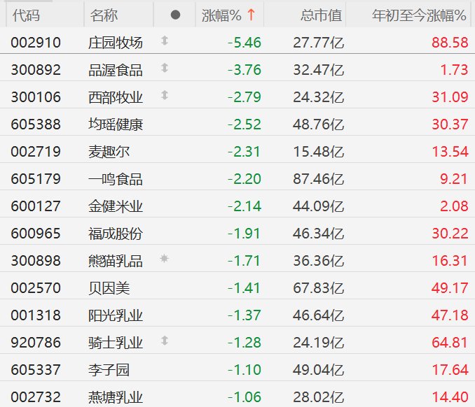 MACD金叉信号形成,这些股涨势不错! | 代码 | 名称 | | 涨幅% ↑ | 总市值 | 年初至今涨幅% | | --- | --- | --- | --- | --- | --- | | 002910 | 庄园牧场 | 1 | -5.46 | 27.77亿 | 88.58 | | 300892 | 品屋食品 | 1 | -3.76 | 32.47 乙 | 1.73 | | 300106 | 西部牧业 | 1 | -2.79 | 24.32亿 | 31.09 | | 605388 | 均瑶健康 | | -2.52 | 48.76 乙 | 30.37 | | 002719 | 麦趣尔 | | -2.31 | 15.48亿 | 13.54 | | 605179 | 一鸣食品 | | -2.20 | 87.46 Z | 9.21 | | 600127 | 我在米亚 | | -2.14 | 44.09亿 | 2.08 | | 600965 | 福成股份 | | -1.91 | 46.34 乙 | 30.22 | | 300898 | 熊猫乳品 | ** | -1.71 | 36.36亿 | 16.31 | | ...