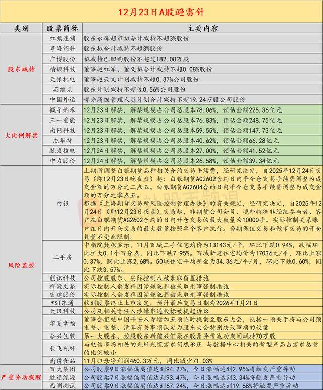 1、创识科技:公司控股股东、实际控制人被采取留置措施。 2、祥源文旅:实际控制人俞发祥因涉嫌犯罪被采取刑事强制措施。 3、交建股份:实际控制人俞发祥因涉嫌犯罪被采取刑事强制措施。 4、红旗连锁:股东永辉超市拟合计减持不超3%股份。 5、粤海饲料:股东拟合计减持不超3%股份。 6、广博股份:拟减持已回购股份不超过182.08万股。 7、精锻科技:董事赵红军、董义拟合计减持不超0.08%股份。 8、天银机电:董事赵云文计划减持不超0.37%公司股份。 9、英维克:股东计划减持不超过0.56%公司股份。 10、中国外运:部分高级管理人员计划合计减持不超19.24万股公司股份。 11、*ST东通:收到股票终止上市决定,预计最后交易日期为2026年1月21日。 12、天玑科技:公司及相关责任人涉嫌串通投标被提起诉讼。 导读:智通财经12月23日投资避雷针,近日,A股及海外市场潜在风险事件如下。国内经济信息方面包 括:1)上期所调整白银期货品种相关合约交易手续费与交易限额;2)快手遭到黑灰产攻击,已报警; 公司方面重点关注包括:1)创识科技公司控股股东、实际控制人被采取留置措施;2)祥源文旅实际控 制人俞发祥因涉嫌犯罪被 ...