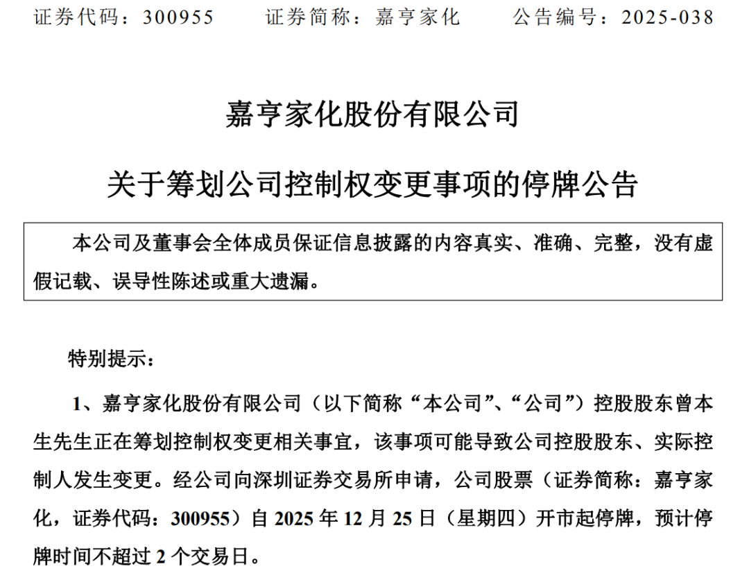 嘉亨家化筹划控制权变更!"二代"刚接棒一年!公司业绩持续恶化。 来源|读创财经 编辑|靳恩琦 责编|朱峰 12月24日晚间,嘉亨家化(300955)披露公告称,因筹划公司控制权变更事项,公司股票自12月25日起停牌,预计停牌时间不超过2个交易日。 值得一提的是,12月24日,嘉亨家化股价盘中大涨,一度涨超13%,截至收盘,公司股价报41.51元/股,涨幅为8.32%,最新市值为41.8亿元。今年以来该 股涨幅达167%。 嘉亨家化主要从事日化产品OEM/ODM及塑料包装容器的研发设计、生产。公司的主要客户均为全球和国内知名的化妆品、日化产品厂商及新兴品牌商, 包括强生、上海家化、贝泰妮、郁美净、百雀羚、多特瑞、维多利亚的秘密、壳牌、利洁时、联合利华、宝洁等。公司于2021年3月登陆深交所创业板。 读创财经注意到,2024年11月,嘉亨家化完成了董事会换届,创始人曾本生退居幕后,曾本生之子、1974年出生的曾焕彬被选举为嘉亨家化第三届董事会 董事长,并继续担任总经理一职;曾本生之女、1976年出生的曾雅萍则出任副董事长及副总经理。自此,这家日化企业完成"二代"接班。 公告显示,嘉亨家化于当日收到控股股东曾本生的 ...