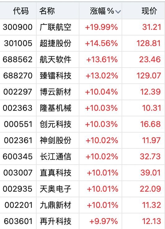 截至发稿,神剑股份6连板,广联航空、 博云新材、隆基机械、长江通信、 天奥电子、 再升科技等多 股涨停,航天软件、超捷股份涨超10%。 | 代码 | 名称 | 涨幅%v | 现价 | | --- | --- | --- | --- | | 300900 | 广联航空 | +19.99% | 31.21 | | 301005 | 超捷股份 | +14.56% | 128.81 | | 688562 | 航天软件 | +13.61% | 23.46 | | 688270 | 臻镭科技 | +13.02% | 129.07 | | 002297 | 博云新材 | +10.04% | 12.39 | | 002363 | 隆基机械 | +10.03% | 10.31 | | 000551 | 创元科技 | +10.03% | 16.68 | | 002361 | 神剑股份 | +10.02% | 11.97 | | 600345 | 长江通信 | +10.02% | 32.73 | | 003007 | 直真科技 | +10.01% | 39.01 | | 002935 | 天奥电子 | +10.01% | 22.0 ...