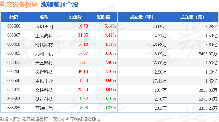 证券之星消息,1月6日轨交设备板块较上一交易日上涨2.12%,雷尔伟领涨。当日上证指数报收于 4083.67,上涨1.5%。深证成指报收于14022.55,上涨1.4%。轨交设备板块个股涨跌见下表: | 代码 | 名称 | 收盘价 | 涨跌幅 | 成交量(手) | 成交额(元) | | | --- | --- | --- | --- | --- | --- | --- | | 301016 | 雷尔伟 | 26.51 | 20.01% | 14.44万 | | 3.59 Z | | 000008 | 神州 高铁 | 3.15 | 10.14% | 203.13万 | | 6.25亿 | | 920541 | 铁大科技 | 13.97 | 5.20% | 5.45万 | | 7527.76万 | | 603680 | 今创重团 | 15.96 | 5.00% | 18.12万 | | 2.78亿 | | 605001 | 威奧股份 | 7.96 | 3.92% | 24.23万 | | 1.93亿 | | 920027 | 交大铁发 | 22.49 | 2.79% | 1.92万 | | 4285.39万 | ...