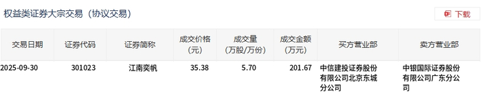 | 交易日期 | 证券代码 | 证券简称 | 成交价格 (元) | 成交量 (万股/万份) | 成交金额 买方营业部 (万元) | 卖方营业部 | | --- | --- | --- | --- | --- | --- | --- | | 2025-09-30 | 301023 | 江南奕帆 | 35.38 | 5.70 | 201.67 中信建投证券股份 | 中银国际证券股份 | | | | | | | 有限公司北京东城 | 有限公司广东分公 | | | | | | | 分公司 | רנ | 9月30日,江南奕帆大宗交易成交5.7万股,成交额201.67万元,占当日总成交额的2.77%,成交价35.38 元,较市场收盘价41.14元折价14%。 ...