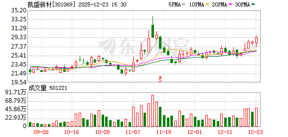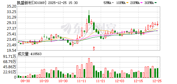 12月26日,凯盛新材盘中下跌2.01%,截至10:00,报28.30元/股,成交3.11亿元,换手率2.77%,总市值 119.04亿元。 资金流向方面,主力资金净流出3733.70万元,特大单买入921.31万元,占比2.96%,卖出1903.83万元, 占比6.12%;大单买入6328.54万元,占比20.34%,卖出9079.73万元,占比29.18%。 凯盛新材今年以来股价涨92.26%,近5个交易日跌0.25%,近20日涨5.83%,近60日涨26.91%。 责任编辑:小浪快报 截至12月19日,凯盛新材股东户数4.83万,较上期增加10.30%;人均流通股8091股,较上期减少 9.34%。2025年1月-9月,凯盛新材实现营业收入7.74亿元,同比增长11.22%;归母净利润1.16亿元,同 比增长121.56%。 分红方面,凯盛新材A股上市后累计派现2.94亿元。近三年,累计派现1.89亿元。 机构持仓方面,截止2025年9月30日,凯盛新材十大流通股东中,香港中央结算有限公司位居第七大流 通股东,持股260.49万股,相比上期减少64.73万股。 资料显示,山东凯盛新材料股份有限公司位于山 ...