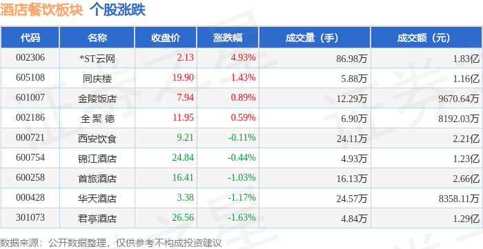 | 代码 | 名称 | 收盘价 | 涨跌幅 | 成交量(手) | 成交额(元) | | --- | --- | --- | --- | --- | --- | | 002306 | *ST云网 | 2.13 | 4.93% | 86.98万 | 1.83亿 | | 605108 | 同庆楼 | 19.90 | 1.43% | 5.88万 | 1.16亿 | | 601007 | 金陵饭店 | 7.94 | 0.89% | 12.29万 | 9670.64万 | | 002186 | 全聚德 | 11.95 | 0.59% | 6.90万 | 8192.03万 | | 000721 | 西安饮食 | 9.21 | -0.11% | 24.11万 | 2.21亿 | | 600754 | 锦江酒店 | 24.84 | -0.44% | 4.93万 | 1.23亿 | | 600258 | 首旅酒店 | 16.41 | -1.03% | 16.13万 | 2.66亿 | | 000428 | 华天酒店 | 3.38 | -1.17% | 24.57万 | 8358.11万 | | 301073 | 君亭酒店 | 2 ...