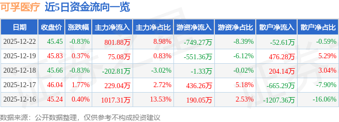 证券之星消息,截至2025年12月24日收盘,可孚医疗(301087)报收于45.35元,下跌0.55%,换手率 0.59%,成交量1.15万手,成交额5177.75万元。 12月24日的资金流向数据方面,主力资金净流出197.99万元,占总成交额3.82%,游资资金净流入 268.38万元,占总成交额5.18%,散户资金净流出70.39万元,占总成交额1.36%。 近5日资金流向一览见下表: | | | | | 日期 收盘价 涨跌幅 主力净流入 主力净占比 游资净流入 游资净占比 散户净占比 | | | | | | --- | --- | --- | --- | --- | --- | --- | --- | --- | | 2025-12-24 | 45.35 -0.55% | | -197.99万 | -3.82% | 268.38万 | 5.18% | -70.39万 | -1.36% | | 2025-12-23 | | 45.60 0.33% | ● 402.64万 | 6.84% | 14.70万 | 0.25% | -417.33万 | -7.08% | | 2025-12-22 | | 45 ...