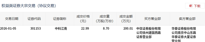 1月5日,中科江南大宗交易成交8.7万股,成交额200.01万元,占当日总成交额的0.2%,成交价22.99 元,较市场收盘价26.35元折价12.75%。 | | | 权益类证券大宗交易(协议交易) | | | | 团 下载 | | --- | --- | --- | --- | --- | --- | --- | | 卖方营业部 | 交易日期 | 证券代码 证券简称 | 成交价格 (元) | 成交量 (万股/万份) | 成交金额 买方营业部 (万元) | | | 华泰证券股份有限 | 2026-01-05 | 301153 中科江南 | 22.99 | 8.70 | 200.01 中信证券股份有限 | | | 公司南京中山东路 | | | | | 公司徐州建国西路 | | | 精心地 | | | | | 证券营业部 | 华泰证券大厦证券 | ...