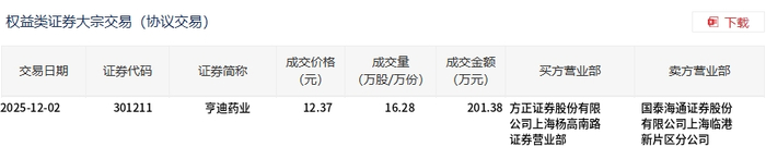 大宗交易概况 - 2025年12月2日,亨迪药业发生一笔大宗交易,成交量为16.28万股,成交金额为201.38万元,占该股当日总成交额的1.16% [1] - 该笔大宗交易的成交价格为12.37元,相较于当日市场收盘价14.75元,折价幅度为16.14% [1] 交易细节 - 交易证券代码为301211,证券简称为亨迪药业 [2] - 买方营业部为方正证券股份有限公司上海杨高南路证券营业部 [2] - 卖方营业部为国泰海通证券股份有限公司上海临港新片区分公司 [2]