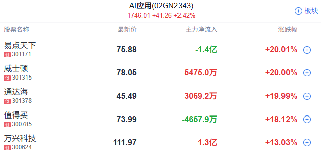 目前,市场最担心的仍是成交量持续放大之后的调整风险。对此,中泰证券表示,长线资金托底,政策 推动下市场或维持交投活跃。东方证券认为,从历史经验来看,成交量持续放大之后,的确会引起市场 波动,尤其在沪综指17连阳且逼近4200点之时。 热门板块 1、AI应用领涨市场 以GEO、制药为首等AI应用方向领涨市场,易点天下、利欧股份、浙文互联、引力传媒、博瑞传播3连 板,天龙集团、值得买高开超10%。 1月13日,三大指数高开低走,截至发稿,沪指跌0.57%,深证成指跌0.63%,创业板指跌0.59%。 盘面上,以GEO、制药为首等AI应用方向领涨市场,易点天下、通达海、迪安诊断20CM涨停;创新药 概念股走强,泓博医药20cm涨停;商业航天板块早盘走低,西部材料、雷科防务、航天发展、航天机 电、中国卫通等多股跌停。 | | AI应用(02GN2343) | | + 板块 | | --- | --- | --- | --- | | | 1746.01 +41.26 +2.42% | | | | 股票名称 | 最新价 | 主力净流入 | 涨跌幅 | | 易点天下 图 301171 | 75.88 | -1.4亿 | + ...
