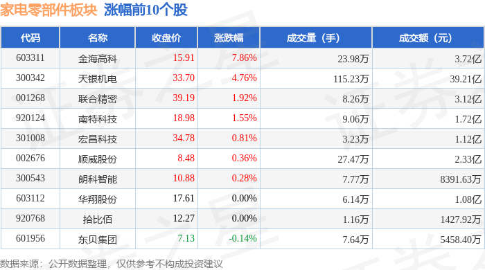 证券之星消息,12月25日家电零部件板块较上一交易日上涨3.48%,同星科技领涨。当日上证指数报收 于3959.62,上涨0.47%。深证成指报收于13531.41,上涨0.33%。家电零部件板块个股涨跌见下表: 以上内容为证券之星据公开信息整理,由AI算法生成(网信算备310104345710301240019号),不构成投资建议。 | 代码 | 名称 | 收盘价 | 涨跌幅 | 成交量(手) | 成交额(元) | | | --- | --- | --- | --- | --- | --- | --- | | 301252 | 同星科技 | 30.98 | 8.63% | 10.91万 | | 3.28亿 | | 002050 | 二化智控 | 47.56 | 5.50% | 221.72万 | | 103.83 Z | | 300342 | 天银机电 | 32.17 | 4.52% | 130.46万 | | 41.90 乙 | | 300403 | 汉宇隼团 | 13.96 | 3.87% | 29.13万 | | 4.03亿 | | 301280 | 珠城科技 | 52.30 | 3.81% | 5. ...