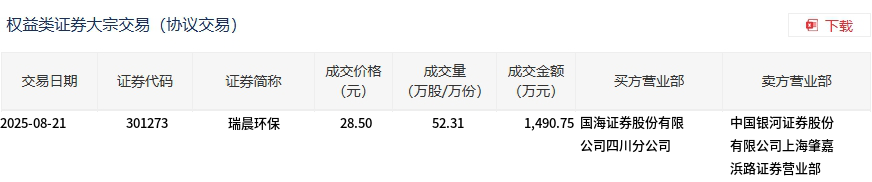大宗交易概况 - 2025年8月21日瑞晨环保发生大宗交易成交52.31万股 成交额1490.75万元 占当日总成交额23.35% [1][2] - 成交价格28.5元 较市场收盘价29.57元折价3.62% [1] 交易细节 - 买方营业部为国海证券股份有限公司四川分公司 [2] - 卖方营业部为中国银河证券股份有限公司上海肇嘉浜路证券营业部 [2] - 证券代码301273 证券简称瑞晨环保 [2]