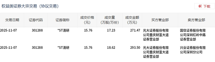 | 交易日期 | 证券代码 | 证券简称 | 成交价格 | 成交量 | 成交金额 | 买方营业部 | 卖方营业部 | | --- | --- | --- | --- | --- | --- | --- | --- | | | | | (元) | (万股/万份) | (万元) | | | | 2025-11-04 | 301288 | *ST清研 | 15.10 | 50.00 | | 755.00 光大证券股份有限 | 国信证券股份有限 | | | | | | | | 公司重庆金昌路证 | 公司深圳红岭中路 | | | | | | | | 券营业部 | 证券营业部 | 11月4日,*ST清研大宗交易成交50万股,成交额755万元,占当日总成交额的37.61%,成交价15.1元,较市场收盘价16.59元 折价8.98%。 ...