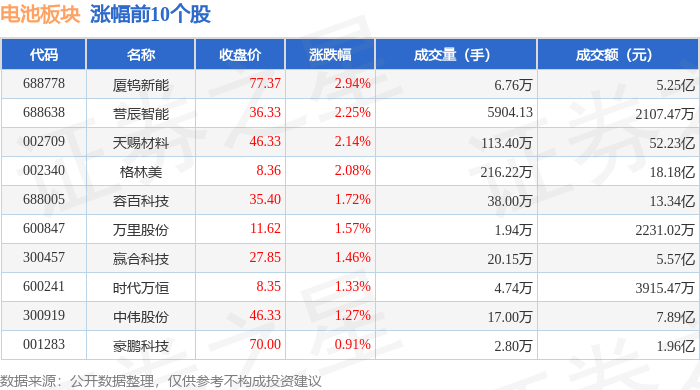 电池板块市场表现 - 2023年12月31日,电池板块整体下跌0.84%,表现弱于上证指数(上涨0.09%)和深证成指(下跌0.58%)[1] - 板块内个股表现分化,海科新源领跌,跌幅达5.98%,而厦钨新能领涨,涨幅为2.94%[1][2] - 从资金流向看,当日电池板块主力资金净流出16.96亿元,而游资和散户资金分别净流入2.63亿元和14.33亿元[2] 领涨个股详情 - 厦钨新能收盘价77.37元,上涨2.94%,成交额5.25亿元[1] - 昔辰智能收盘价36.33元,上涨2.25%,成交额2107.47万元[1] - 天赐材料收盘价46.33元,上涨2.14%,成交额52.23亿元,并获得主力资金净流入7.671亿元,主力净占比达14.69%[1][3] - 格林美收盘价8.36元,上涨2.08%,成交额18.18亿元,主力资金净流入3606.56万元[1][3] - 赢合科技收盘价27.85元,上涨1.46%,成交额5.57亿元,主力资金净流入5046.18万元[1][3] 领跌个股详情 - 海科新源收盘价64.41元,下跌5.98%,成交额14.21亿元[2] - 铜冠铜箔收盘价34.28元,下跌4.09%,成交额9.47亿元[2] - 科达利收盘价157.86元,下跌4.00%,成交额9.72亿元[2] - 欣旺达收盘价26.15元,下跌3.82%,成交额16.48亿元[2] - 鹏辉能源收盘价53.22元,下跌3.76%,成交额9.63亿元[2] 个股资金流向亮点 - 天际股份获得主力资金净流入1.43亿元,主力净占比2.16%[3] - 富临精工主力资金净流入6999.05万元,主力净占比6.55%[3] - 嘉元科技主力资金净流入5524.75万元,主力净占比11.88%[3] - 紫建电子同时获得主力资金净流入2237.11万元(净占比10.85%)和游资净流入2192.28万元(净占比10.63%)[3] - 格林美在主力资金净流入的同时,遭遇游资净流出7212.13万元[3]