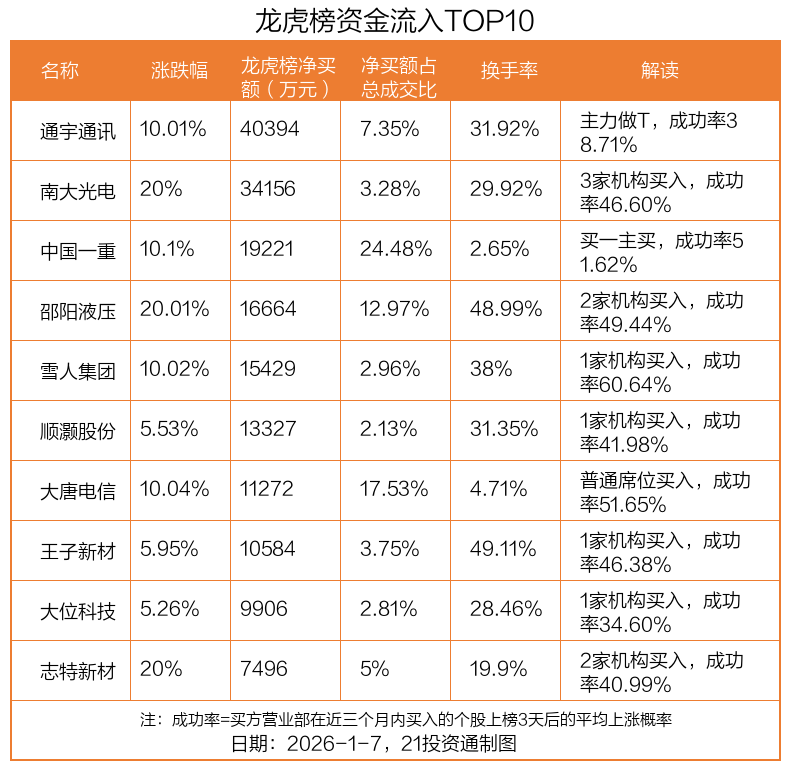 1月7日,上证指数上涨0.05%,深证成指上涨0.06%,创业板指上涨0.31%。盘后龙虎榜数据显示,共有52只个股 因当日异动登上龙虎榜,资金净流入最多的是通宇通讯(002792.SZ),达4.04亿元。 | 名称 | 涨跌幅 | 龙虎榜净买 | 净买额占 | 换手率 | 解读 | | --- | --- | --- | --- | --- | --- | | | | 额(万元 | 总成交比 | | | | 通宇通讯 | 10.01% | 40394 | 7.35% | 31.92% | 主力做T,成功率3 | | | | | | | 8.71% | | 南大光电 | 20% | 34156 | 3.28% | 29.92% | 3家机构买入,成功 | | | | | | | 率46.60% | | 中国一直 | 10.1% | 19221 | 24.48% | 2.65% | 买一主买,成功率5 | | | | | | | 1.62% | | 邵阳液压 | 20.01% | 166664 | 12.97% | 48.99% | 2家机构买入,成功 | | | | | | | 率49.44% | | 雪人集 ...