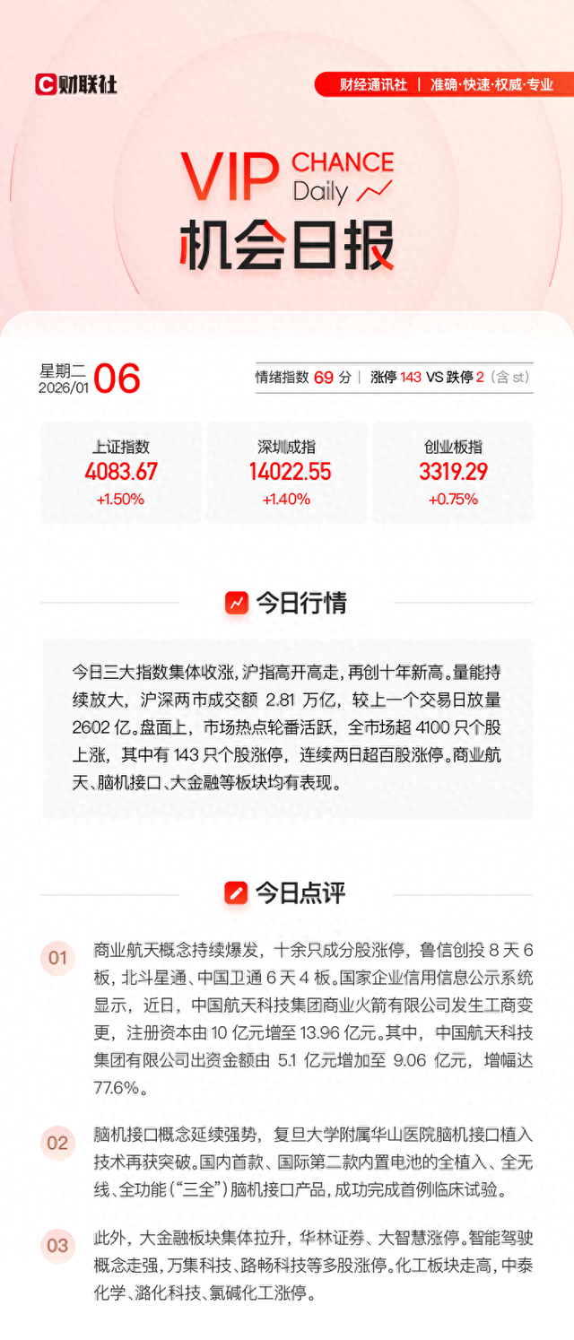 商业航天 - 中国航天科技集团商业火箭有限公司注册资本由10亿元增至13.96亿元,其中中国航天科技集团出资额由5.1亿元增至9.06亿元,增幅达77.6% [5] - 蓝箭航天正式冲刺“商业火箭第一股”,商业航天有望迎来黄金发展期 [9] - 我国低轨卫星互联网从2025年下半年已进入批量发射建设阶段,2026年有望迎来更大批量发射,产业发展进一步加速 [11] - 随着多项核心政策密集发布,商业航天战略地位进一步提升,2026年将成为商业航天发展的关键年份,行业有望迎来戴维斯双击 [13] - 蓝箭航天科创板IPO获受理拟融资75亿元,金风科技通过直接持股8.3028%和间接持股1.7934%合计持股10.0962%,是其最大机构投资者之一 [13] - 钧达股份与国内稀缺的卫星电池生产商尚翼光电签署战略合作协议,公司已在下一代钙钛矿领域提前布局,合作有望推动其卡位太空光伏技术 [15] - 中国卫通是我国自主可控的卫星通信运营龙头,拥有18颗卫星资源及稀缺资质壁垒,服务覆盖全国及“一带一路”区域,正加速向航空互联网、海事通信等高增长领域拓展 [17] - 中国卫通已建成首张高轨卫星互联网,提供高速接入服务,依托高通量资源在海洋、航空、应急等多领域布局,拓展“卫星通信+无人机”等应用 [17] - 中国卫通收获3连板,区间最高涨幅达49.07% [18] 脑机接口 - 复旦大学附属华山医院脑机接口植入技术再获突破,国内首款、国际第二款内置电池的全植入、全无线、全功能脑机接口产品成功完成首例临床试验 [20] - 脑机接口产业正加速迈向规模化、规范化与商业化的新阶段,机构预计2030年行业市场规模将突破百亿美元 [22] - 翔宇医疗以非侵入式康复全场景为当前核心,同步探索侵入式/半侵入式技术,并与高校合作研发,多款设备正在注册,覆盖神经康复、精神心理等多场景 [24] - 翔宇医疗项目已进入超500家医疗机构,目标2026年覆盖千家顶尖三甲医院,形成全场景产品矩阵 [24] - 熵基科技以多模态生物识别与视觉分析技术为基础切入脑机接口领域,技术路线采用“脑电+眼电+肌电”多模态融合,聚焦教育、医疗、养老三大应用场景进行产品研发 [26] - 熵基科技脑机合资公司正在筹备,原型机按计划推进,公司同时拓展智慧办公等主业,并与华为等企业合作为脑机技术场景化落地构建基础 [26] - 脑机接口是医疗投资也是科技投资,长期来看若能实现增强人、与AI融合、脑控人形机器人等,有望打开万亿市场空间 [28] - 南京熊猫基于脑机接口技术的多模态人机交互系统集成关键技术研发,收获2连板,4日最高涨18.33% [28] - 脑机接口行业正从早期向初步商业化阶段过渡,相关公司如三博脑科、美好医疗、翔宇医疗、爱朋医疗、荣泰健康、创新医疗、伟思医疗近期股价表现强劲 [38] 大金融 - 国家金融监督管理总局发布通知,下调了沪深300、红利低波和科创板等长期持仓资产风险因子,有助于培育耐心资本并支持科技创新 [30] - 大金融持续走强,资金博弈牛市预期发酵,看盘软件+券商的逻辑市场认可度相对较高,指南针作为高辨识度的容量标的有望享受流动性溢价,其在1月6日大涨9.61% [31] 智能驾驶 - 英伟达计划2027年测试一项无人驾驶出租车服务 [33] - 中国首批L3级自动驾驶汽车开启规模化上路运行,高阶智驾平权的实现需要技术突破、成本下探以及法律法规、标准体系的支撑,面向C端的L3级功能释放仍需时日,中短期看好B端Robotaxi商业化放量带来的投资机会 [34] - 中国L3正式进入“可量产、可上路”阶段,自动驾驶技术走向量产应用 [36]
