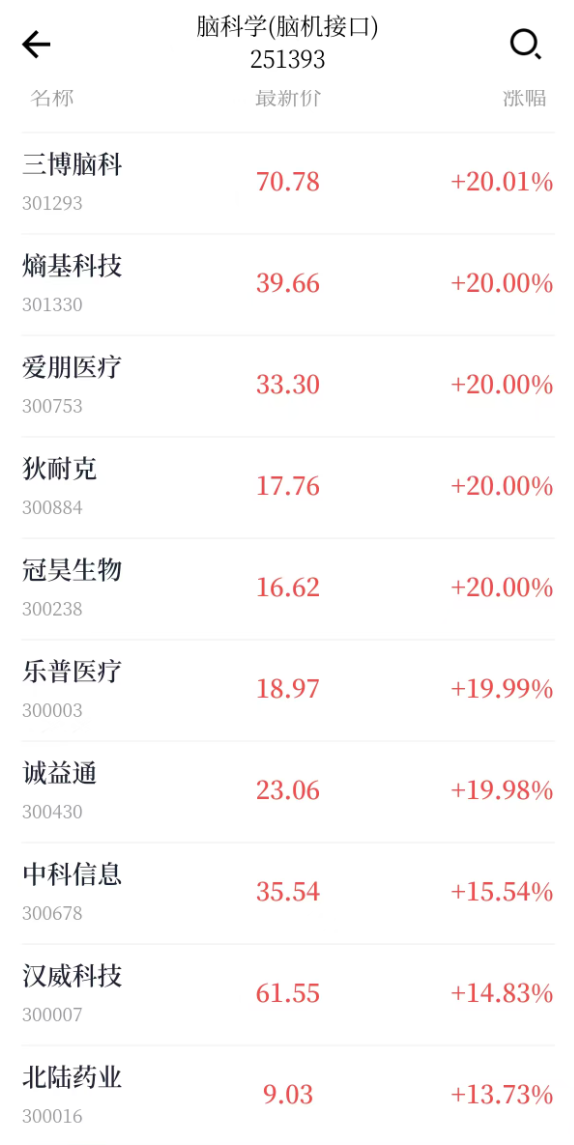 另外,马斯克近日在社交媒体上表示,其脑机接口公司Neuralink将于2026年开始对脑机接口设备进 行"大规模生产"。 | 代码 | 名称 | | 涨幅% ↓ | 总市值 | 年初至今涨幅% | | --- | --- | --- | --- | --- | --- | | 688580 | 伟思医疗 | 1 | 20.01 | 66.75亿 | 44.01 | | 301293 | 三博脑科 | 1 | 20.01 | 175亿 | 44.01 | | 688626 | 翔宇医疗 | 1 | 20.00 | 139亿 | 44.00 | | 300753 | 爰朋医疗 | 1 | 20.00 | 50.37 乙 | 44.00 | | 301330 | 熵基科技 | 1 | 19.99 | 112亿 | 43.99 | | 301363 | 美好医疗 | 1 | 19.99 | 197亿 | 43.99 | | 688273 | 麦澜德 | 1 | 19.99 | 61.22 亿 | 43.98 | | 300430 | 诚益通 | 1 | 18.47 | 74.60亿 | 42.14 | | 30040 ...