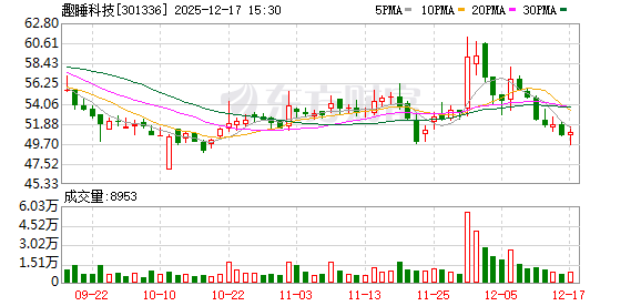 公司股价与交易表现 - 2025年11月25日盘中,公司股价上涨2.52%,报52.50元/股,成交802.70万元,换手率0.51%,总市值21.00亿元 [1] - 公司股价今年以来累计下跌2.35%,近5个交易日下跌4.16%,近20日上涨0.38%,近60日下跌13.95% [1] - 今年以来公司已3次登上龙虎榜,最近一次为2025年3月19日,当日龙虎榜净买入2494.38万元,买入总计1.58亿元占总成交额21.50%,卖出总计1.33亿元占总成交额18.11% [1] 公司基本概况与主营业务 - 公司全称为成都趣睡科技股份有限公司,成立于2014年10月22日,于2022年8月12日上市 [1] - 公司主营业务为高品质易安装家具、家纺等家居产品的研发、设计、生产(以外包生产方式实现)与销售 [1] - 主营业务收入构成为:床垫产品37.06%,枕头产品28.62%,被子、毯类产品13.57%,床类产品12.56%,沙发产品2.91%,生活周边产品2.81%,其他家具产品2.47% [1] 行业归属与市场特征 - 公司所属申万行业为轻工制造-家居用品-成品家居 [2] - 公司所属概念板块包括微盘股、小盘、京东概念、电子商务、户外露营等 [2] 股东结构与持股变化 - 截至2025年11月20日,公司股东户数为8606户,较上期减少3.61% [2] - 截至同期,人均流通股为3535股,较上期增加3.74% [2] - 截至2025年9月30日,十大流通股东中,诺安多策略混合A(320016)已退出十大流通股东之列 [3] 公司财务业绩 - 2025年1月至9月,公司实现营业收入2.13亿元,同比增长10.60% [2] - 同期,公司实现归母净利润2162.96万元,同比增长13.46% [2] 公司分红情况 - 公司自A股上市后累计派发现金红利2572.10万元 [3]