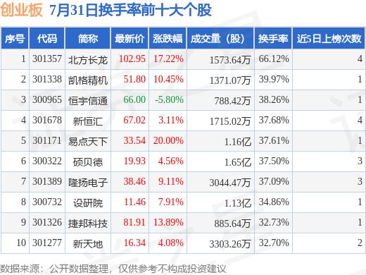 市场表现 - 7月31日A股收盘上证指数报3573 21点下跌1 18% 深圳成指报11009 77点下跌1 73% [1] - 创业板换手率前10大个股中9只收涨 平均涨幅达10 04% [1] 个股数据 - 北方长龙(301357)以换手率66 12%位列榜首 最新价102 95元 涨幅17 22% 成交量1573 64万股 近5日上榜4次 [2] - 凯格精机(301338)换手率39 97% 最新价51 80元 涨幅10 45% 成交量1371 07万股 [2] - 恒宇信通(300965)是榜单中唯一下跌个股 跌幅5 80% 换手率38 26% 成交量788 42万股 [2] - 易点天下(301171)涨幅达20%封涨停板 成交量1 16亿股 换手率37 61% [2] - 新恒汇(301678)和硕贝德(300322)分别上榜4次和3次 换手率37 68%和37 50% [2] 交易活跃度 - 隆扬电子(301389)成交量3044 47万股 换手率37 09% 涨幅9 11% [2] - 设研院(300732)成交量1 13亿股 换手率34 86% 涨幅7 91% [2] - 捷邦科技(301326)涨幅13 89% 换手率32 73% 成交量885 64万股 [2] - 新天地(301277)换手率32 70% 成交量3303 26万股 涨幅4 08% [2]