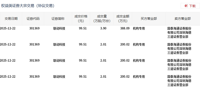 | 交易日期 | 证券代码 | 证券简称 | 成交价格 | 成交量 | 成交会额 | 买方营业部 | 卖方营业部 | | --- | --- | --- | --- | --- | --- | --- | --- | | | | | (元) | (万股/万份) | (万元) | | | | 2025-12-22 | 301369 | 联动科技 | 99.51 | 3.90 | 388.09 机构专用 | | 国泰海通证券股份 | | | | | | | | | 有限公司深圳海德 | | | | | | | | | 三道证券营业部 | | 2025-12-22 | 301369 | 联动科技 | 99.51 | 2.01 | 200.02 机构专用 | | 国泰海通证券股份 | | | | | | | | | 有限公司深圳海德 | | | | | | | | | 三道证券营业部 | | 2025-12-22 | 301369 | 联动科技 | 99.51 | 2.01 | 200.02 机构专用 | | 国泰海通证券股份 | | | | | | | | | 有限公司深圳海德 | | | | | | | | | ...