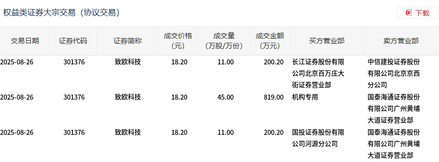 交易概况 - 8月26日致欧科技发生大宗交易67万股,成交总额1219.4万元,占当日总成交额7.88% [1] - 成交价格18.2元,较市场收盘价20元折价9% [1] 交易明细 - 分三笔成交:11万股(200.2万元)、45万股(819万元)、11万股(200.2万元)[2] - 买方包括长江证券北京百万庄大街营业部、机构专用席位及国投证券河源分公司 [2] - 卖方主要为国泰海通证券广州黄埔大道营业部(两笔合计56万股)和中信建投北京京西分公司 [2] 价格特征 - 三笔交易均采用统一成交价18.2元 [2] - 机构专用席位通过大宗交易买入45万股,占比67.16% [2]