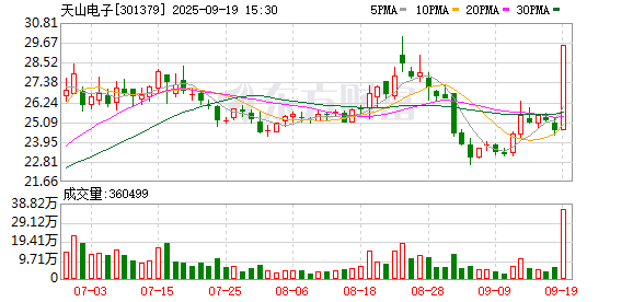 股价表现 - 天山电子股价创历史新高 报31.53元 涨幅6.74% [2] - 成交量1575.79万股 成交金额4.82亿元 换手率12.44% [2] - A股总市值62.29亿元 流通市值39.94亿元 [2] 行业表现 - 电子行业整体涨幅2.07% 361只个股上涨 [2] - 行业内6只个股涨停 包括冠捷科技、国光电器等 [2] - 118只个股下跌 臻镭科技跌幅13.54%居首 永新光学跌7.73% 晶赛科技跌5.95% [2] 融资数据 - 最新两融余额2.25亿元 融资余额2.25亿元 [2] - 近10日融资余额增加927.91万元 环比增长4.30% [2] 财务数据 - 上半年营业收入8.56亿元 同比增长29.66% [2] - 净利润7492.80万元 同比增长15.46% [2] - 基本每股收益0.3829元 加权平均净资产收益率5.37% [2]