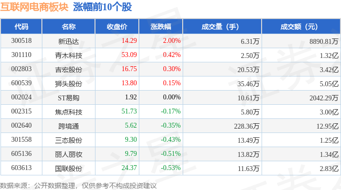 板块整体表现 - 互联网电商板块较上一交易日下跌0.61% [1] - 上证指数上涨0.33%至3609.71点 深证成指上涨0.64%至11289.41点 [1] - 板块主力资金净流出3.7亿元 游资资金净流出4045.26万元 散户资金净流入4.11亿元 [2] 领涨个股表现 - 新迅达涨幅2.00% 收盘价14.29元 成交量6.31万手 成交额8890.81万元 [1] - 青木科技涨幅0.42% 收盘价53.09元 成交量2.50万手 成交额1.32亿元 [1] - 吉宏股份涨幅0.30% 收盘价16.75元 成交量20.53万手 成交额3.42亿元 [1] 领跌个股表现 - 赛维时代跌幅2.66% 收盘价21.63元 成交量9.86万手 成交额2.14亿元 [2] - ST通葡跌幅2.18% 收盘价3.14元 成交量8.32万手 成交额2599.39万元 [2] - 南极电商跌幅1.58% 收盘价3.73元 成交量70.37万手 成交额2.62亿元 [2] 资金流向特征 - 青木科技主力净流入1226.31万元 占比9.29% [3] - 焦点科技主力净流入1000.80万元 占比3.34% [3] - ST易购主力净流入247.56万元 占比12.12% [3] - 三态股份主力净流出1179.61万元 占比9.46% [3] - 华鼎股份主力净流出952.24万元 占比19.43% [3]