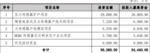 | | | | 早过: 几元 | | --- | --- | --- | --- | | 序号 | 项目名称 | 投资总额 | 拟投入募集资金 | | 1 | 压力传感器扩产项目 | 28,000.00 | 26,860.00 | | 2 | 陶瓷电容式压力传感器产线升级项目 | 7.220.00 | 6.900.00 | | 3 | 力传感器产线建设项目 | 6.250.00 | 6.040.00 | | 4 | MEMS 传感器芯片研发及产业化项目 | 5.790.00 | 5.640.00 | | 5 | 补充流动资金 | 9.000.00 | 9.000.00 | | | 合计 | 56,260.00 | 54, 440. 00 | 截至预案公告日,公司尚未确定本次发行的发行对象,最终是否存在因关联方认购本次发行的股票 而构成关联交易,将在发行结束后公告的《发行情况报告书》中予以披露。 截至报告期末,公司实际控制人为邬若军、黎莉夫妇,邬若军、黎莉夫妇直接及间接控制公司合计 40.2960%的股份。若按本次发行数量的上限测算,本次发行完成后,邬若军、黎莉夫妇仍为公司共同 实际控制人。本次向特定对象发行股 ...