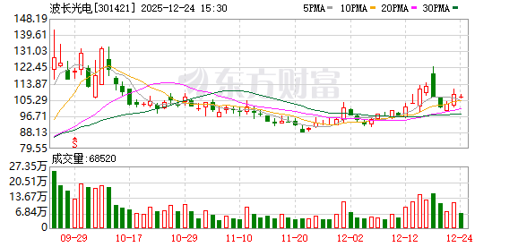 股价与交易表现 - 12月23日,波长光电股价收于108.13元,单日上涨5.04% [1] - 当日发生一笔大宗交易,成交量为3万股,成交金额为309万元,成交价格为103.00元,较收盘价折价4.74% [1] - 近3个月内,公司累计发生1笔大宗交易,合计成交金额为309万元 [1] 资金流向与近期走势 - 近5个交易日,公司股价累计下跌2.59% [1] - 近5个交易日,主力资金合计净流出1.56亿元 [1]