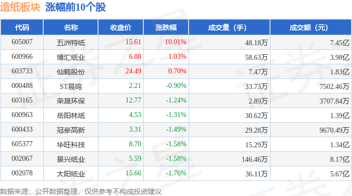 | 代码 | 名称 | 收盘价 | 涨跌幅 | 成交量(手) | 成交额(元) | | --- | --- | --- | --- | --- | --- | | 603863 | 松物资源 | 21.00 | -0.71% | 10.73万 | 2.24亿 | | 600963 | 岳阳林纸 | 4.59 | -0.22% | 46.97万 | 2.16亿 | | 000488 | ST晨鸣 | 2.23 | 1.36% | 41.95万 | 9313.69万 | | 600567 | 山鹰国际 | 1.77 | 1.72% | 285.08万 | 5.01亿 | | 002521 | 齐峰新材 | 8.61 | 1.77% | 6.95万 | 5980.20万 | | 603165 | 荣晟环保 | 12.93 | 2.46% | 4.38万 | 5645.35万 | | 002078 | 太阳纸业 | 15.94 | 2.71% | 77.18万 | 12.10亿 | | 600235 | 民丰特纸 | 6.99 | 2.95% | 17.72万 | 1.23亿 | | 600433 | 冠蒙高新 | ...