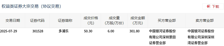 交易概况 - 多浦乐于7月29日发生大宗交易 成交6万股 成交额301.8万元 占当日总成交额3.7% [1] - 成交价格50.3元 较市场收盘价60.61元折价17.01% [1] 交易细节 - 买方营业部为中国银河证券股份有限公司深圳景田证券营业部 [2] - 卖方营业部为中国银河证券股份有限公司深圳深圳湾证券营业部 [2] - 交易通过中国银河证券内部渠道完成 买卖双方均属同一券商不同营业部 [2]