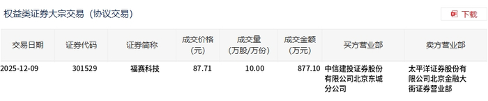 大宗交易概况 - 2025年12月9日,福赛科技发生一笔大宗交易,成交量为10万股,成交额为877.1万元,占该股当日总成交额的2.21% [1] - 该笔大宗交易的成交价格为87.71元,较当日市场收盘价88.6元折价1% [1] 交易细节 - 交易日期为2025年12月09日,证券代码为301529,证券简称为福赛科技 [2] - 成交价格为87.71元,成交量为10.00万股,成交金额为877.10万元 [2] - 买方营业部为中信建投证券股份有限公司北京东城分公司 [2] - 卖方营业部为太平洋证券股份有限公司北京金融大街证券营业部 [2]