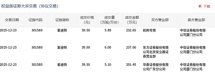 爱迪特大宗交易概况 - 2025年12月23日,爱迪特发生大宗交易,总成交量为16.99万股,总成交额为671.1万元,占该股当日总成交额的22.83% [1] - 本次大宗交易成交均价为39.5元,较当日市场收盘价43.23元折价8.63% [1] 交易明细分析 - 当日共发生三笔大宗交易,成交价格均为39.5元 [2] - 第一笔成交5.89万股,金额232.65万元,买方为机构专用席位,卖方为中信证券股份有限公司厦门分公司 [2] - 第二笔成交6.00万股,金额237.00万元,买方为东方证券股份有限公司北京安立路证券营业部,卖方为中信证券股份有限公司厦门分公司 [2] - 第三笔成交5.10万股,金额201.45万元,买方为华泰证券股份有限公司广东分公司,卖方为中信证券股份有限公司厦门分公司 [2] - 三笔交易的卖方营业部均为中信证券股份有限公司厦门分公司,显示该席位为集中卖方 [2]