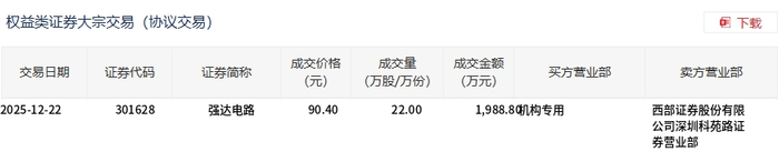 大宗交易概况 - 2025年12月22日,强达电路发生一笔大宗交易,成交量为22万股,成交金额为1988.8万元 [1] - 该笔大宗交易成交价格为90.40元,较当日市场收盘价91.17元折价0.84% [1] - 该笔交易成交额占公司当日总成交额的10.73% [1] 交易细节 - 该笔交易为权益类证券大宗交易(协议交易)[2] - 交易证券代码为301628,证券简称为强达电路 [2] - 买方营业部为机构专用席位 [2] - 卖方营业部为西部证券股份有限公司深圳科苑路证券营业部 [2]