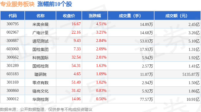 市场表现 - 专业服务板块整体下跌0.07%,跑输上证指数(下跌0.39%)但跑赢深证成指(上涨0.26%)[1] - 板块内个股分化明显,广东建科领跌(-5.10%),中钢天源和安车检测均下跌4.19%[2] - 蓝机器米以4.51%涨幅领涨,广电计量和谱尼测试分别上涨3.21%和2.84%[1] 资金流向 - 板块主力资金净流出4.09亿元,游资资金净流入4134.34万元,散户资金净流入3.68亿元[2] - 广电计量获主力资金净流入4723.86万元(净占比14.49%),但遭游资和散户资金净流出[3] - 力合科创和零点有数分别获主力资金净流入693.85万元(4.05%)和581.87万元(3.87%)[3] 交易活跃度 - 中钢天源成交额达12.11亿元,成交量109.28万手,为板块内最高[2] - 华测检测成交额10.91亿元,成交量77.57万手,位列涨幅榜前列[1] - 谱尼测试成交额5.10亿元,成交量53.03万手,涨幅达2.84%[1]