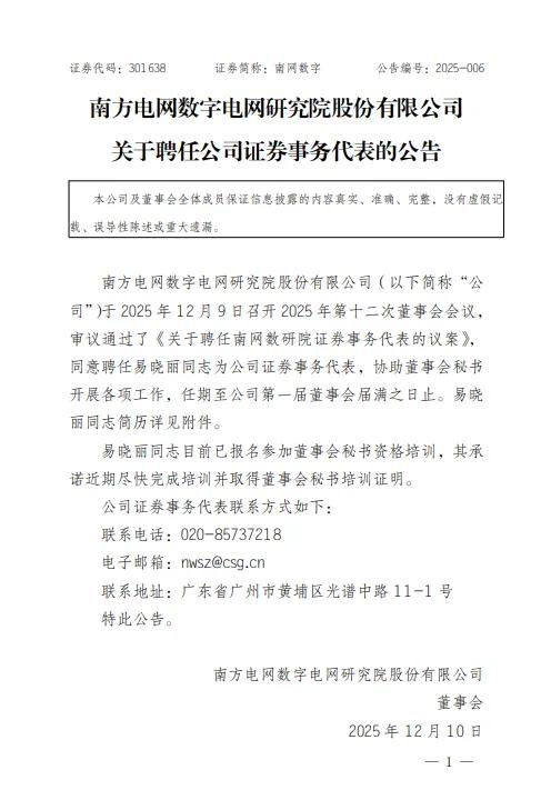 公司人事任命 - 南网数字于2025年12月9日召开董事会会议,审议通过了聘任易晓丽为公司证券事务代表的议案 [1][4][5] - 易晓丽将协助董事会秘书开展工作,任期至公司第一届董事会届满之日止 [1][4][5] - 易晓丽目前已报名参加董事会秘书资格培训,并承诺尽快完成培训取得证明 [5] 新任人员背景 - 易晓丽,女性,1982年出生,中国国籍,无境外永久居留权,拥有本科学历及硕士学位 [4][6] - 现任公司证券管理部(董事会办公室)总经理 [4][6] - 曾任职于广东电网有限责任公司、广东电力信息科技有限公司、南方电网数字电网科技(广东)有限公司等 [4][6] 公司联系信息 - 公司证券事务代表联系电话为020-85737218,电子邮箱为nwsz@csg.cn [5] - 联系地址为广东省广州市黄埔区光谱中路11-1号 [5]