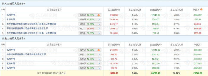 公司股价与交易表现 - 南网数字(301638.SZ)股价于12月3日下跌3.49% [1] - 当日换手率高达38.46%,成交额为20.6亿元 [1] 龙虎榜整体资金流向 - 龙虎榜数据显示,上榜席位全天合计买入1.5亿元,卖出3.58亿元,净卖出2.07亿元 [1] - 五家机构席位合计买入8243万元,卖出2.7亿元,净卖出1.88亿元 [1] 买入前五名席位详情 - 买入金额最大的席位为“机构专用”,买入3188.98万元,占总成交1.55% [1] - 第二名“机构专用”买入2450.16万元,占总成交1.19% [1] - 第三名“东方财富证券股份有限公司如萨东环路第二证券营业部”买入2429.17万元,占总成交1.18% [1] - 第四名“平安提补股份有限公司是华李通路运补算工程”买入2009.32万元,占总成交1.02% [1] - 第五名“东方财富证券股份有限公司拉萨东环路第一证券营业部”买入1816.80万元,占总成交0.88% [1] 卖出前五名席位详情 - 卖出金额最大的席位为“机构专用”,卖出12145.90万元,占总成交5.90% [1] - 第二名“华泰证券股份有限公司深圳前海证券营业部”卖出6001.62万元,占总成交2.91% [1] - 第三名“机构专用”卖出4270.21万元,占总成交2.07% [1] - 第四名“机构专用”卖出3712.30万元,占总成交1.80% [1] - 第五名“机构专用”卖出3658.88万元,占总成交1.78% [1] 买卖前五名席位净额汇总 - 买入前五名与卖出前五名席位总买入额为15036.81万元,占总成交7.30% [1] - 总卖出额为35783.38万元,占总成交17.37% [1] - 合计净卖出20746.58万元 [1]
