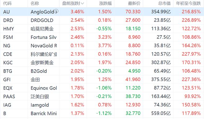 来源:格隆汇APP | 代码 | 名称 | 盘前涨跌 √ | 涨跌幅 | 最新价 | 总市值 | 年初至今涨跌 | | --- | --- | --- | --- | --- | --- | --- | | AU | AngloGold | 3.46% | 1.50% | 70.330 | 354.99 乙 | 216.85% | | DRD | DRDGOLD | 2.54% | 0.18% | 27.600 | 23.85亿 | 226.89% | | HIMY | 哈莫尼黄金 | 2.53% | -0.55% | 18.150 | 113.36亿 | 122.72% | | ESM | Fortuna Silv | 2.46% | 3.23% | 8.960 | 27.5 亿 | 108.86% | | NG | NovaGold R | 0.11% | 3.77% | 8.800 | 35.81亿 | 164.26% | | CDE | 科尔黛伦矿业 | 2.13% | 0.16% | 18.760 | 120.57亿 | 227.97% | | KGC | 金罗斯黄金 | 2.05% | 1.97% ...