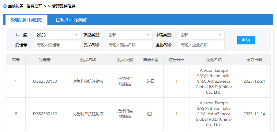 | 受理品种目录浏览 | 在审品种目录浏览 | | | | | | | | --- | --- | --- | --- | --- | --- | --- | --- | | 年 | 2025 v | 药品类型: | रुहेर | ▼ 申请类型: | それ | V | | | 受理号: | 请输入受理号 | 药品名称: | 请输入药品名称 | 企业名称: | 请输入企业名称 | | 查询 | | 序号 | 受理号 | 药品名称 | 药品类型 | 申请类型 | 注册分类 | 企业名称 | 承办日期 | | | JXSS2500153 | 戈鲁利单抗注射液 | 治疗用生 物制品 | 进口 | 1 | Alexion Europe SAS;Patheon Italia S.P.A .; AstraZeneca Global R&D (China) Co., Ltd .; | 2025-12-24 | | 2 | JXSS2500152 | 戈鲁利单抗注射液 | 治疗用生 物制品 | 讲口 | 1 | Alexion Europe SAS;Patheon Italia S.P.A .; AstraZeneca Gl ...