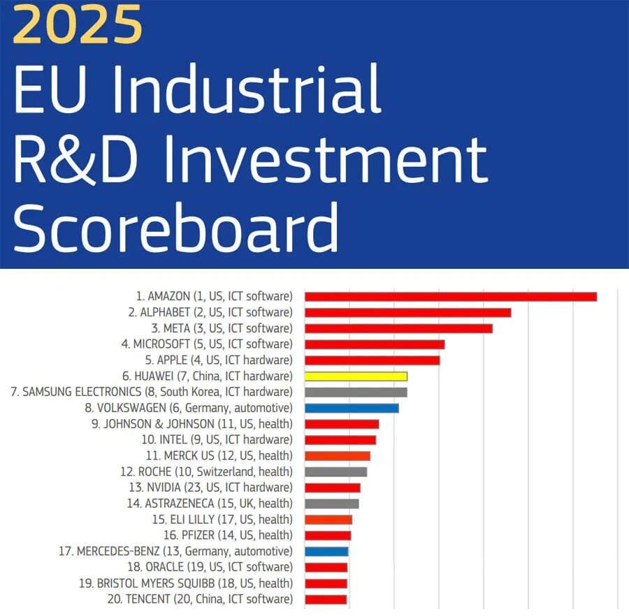 2025全球研发投入百强企业,华为、腾讯、阿里、比亚迪等中国企业上榜